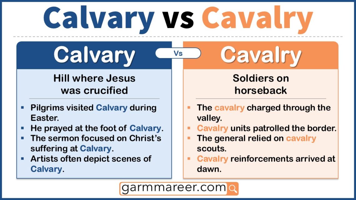 These often confuse learners because both words sound similar, but their meanings are completely different. Calvary is a religious term, while cavalry is a military one. Knowing how to use each word correctly helps you avoid mixing them up in writing and speaking.