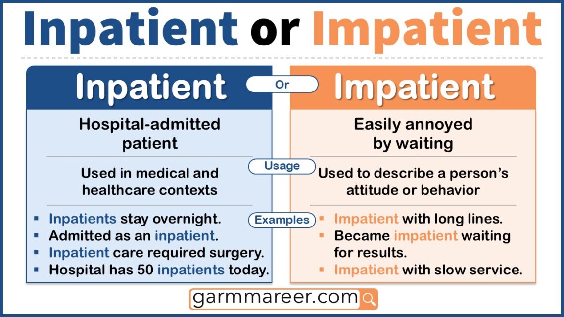Confused about the difference between inpatient and impatient? These two words sound similar but mean very different things. Knowing the difference can help you use them correctly in everyday situations. In this article, we’ll explain their meanings, show examples, and make it easy to remember which is which.