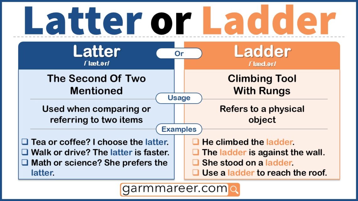 Have you ever wondered whether to use “latter” or “ladder”? These two words sound a bit similar, but they have completely different meanings and uses. Mixing them up is pretty common, so in this article, we’ll break down the difference in a simple way and show you how to use each word correctly in everyday English.