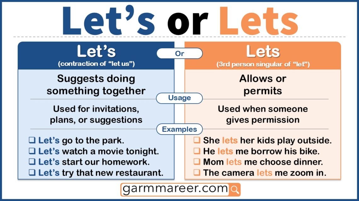 Many people get confused between “let’s” and “lets” because they sound the same, but they are used differently. “Let’s” is a contraction of “let us,” used when suggesting or inviting someone to do something. On the other hand, “lets” is the simple present form of the verb “let,” meaning to allow or permit. Understanding their difference is simple once you see how each is used in real sentences.