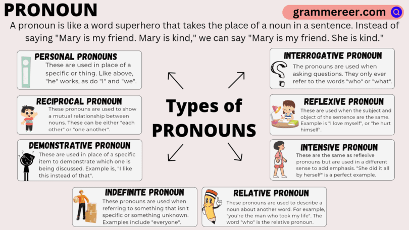 Get to know different types of pronouns in easy terms. A pronoun is a word that takes the place of a noun. This helps avoid repeating the same noun too much. Pronouns, like nouns, can be about people, things, ideas, or places. From personal ones like “he” to reflexive ones like “itself,” each type of pronoun has a specific role in helping us talk clearly.